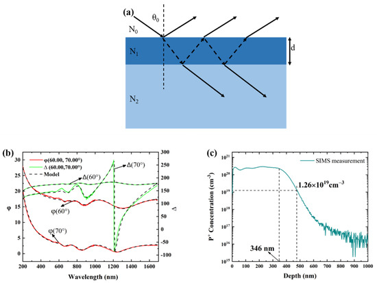 (a) Three-phase (ambient/film (i.e., ion−damaged layer)/substrate) optical model, where d is the film thickness and N is the refractive index; (b) Experimental (solid line) and fitted (dashed line) curves of the ion-implanted sample tested by ellipsometer, where and are used as ellipsometry parameters; (c) Box profile of P ions implantation formed by multiple implants. The implantation profile was measured by SIMS.