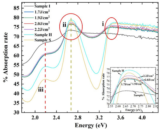 The absorption peak (ii) is present at 2.67 eV in sample S. This absorption band has been discussed by many researchers. Wellmann, et al. [10], Limpijumonong, et al. [8], and Weingärtner, et al. [21] believe that the absorption band (ii) is related to the transition of electrons from the donor level or conduction band to a higher conduction band. A large number of point defects caused by the ion implantation reduced the effective carrier concentration. Eventually, the absorption intensity of the peak (ii) in Sample I declined. After the PLA process, the intensity of peak (ii) gradually increased with increasing laser energy density (see inset of Figure 2). This indicates that the higher the laser energy density is, the higher the effective carrier concentration will be. The result for sample Ls in Figure 2 shows that the intensity of peak (ii) after laser annealing at 2.2 J/cm2 was higher than that of sample I, but lower than that of the 4H-SiC substrate and that of the standard high-temperature annealed sample. Thus, it could be concluded that the electrical activation efficiency of the laser-annealed sample was lower than that of the high-temperature annealed sample; for sample H, its intensity was higher than that of sample S, suggesting that the carrier concentration after high temperature annealing is higher than the 4H-SiC substrate.