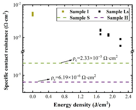 The CTLM was used to calculate the specific contact resistivity () of the four types of samples. The of the ohmic contact achieved by the tunneling current was proportional to . Therefore, the degree of electrical activation of the samples was indirectly verifiable by the . Figure 3 shows the laser energy density dependence of the for the laser-annealed sample in this study. This figure shows that the values of sample Ls decreased sharply compared with that of sample I, and further decreased with the increase of the laser energy density. The P+-implanted impurities in 4H-SiC after PLA were electrically activated, and the activation rate increased with the increase of laser fluence. However, the contact resistance of the sample Ls after PLA at 2.2 J/cm2 was still higher than that of the n-type 4H-SiC substrate (2.33 × 10−5 Ω∙cm2). The of the sample H after high-temperature annealing reached as low as 6.19 × 10−6 Ω∙cm2 (see Figure 3). This electrical result was consistent with that of the absorption band (ii).