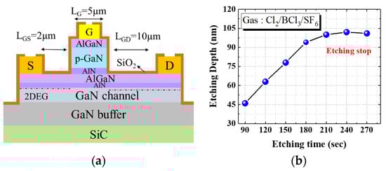 (a) Cross-sectional schematic of the p-GaN gate HEMT, and (b) the etching stop technique.