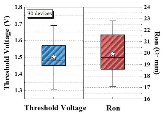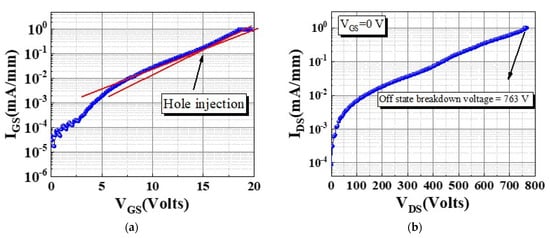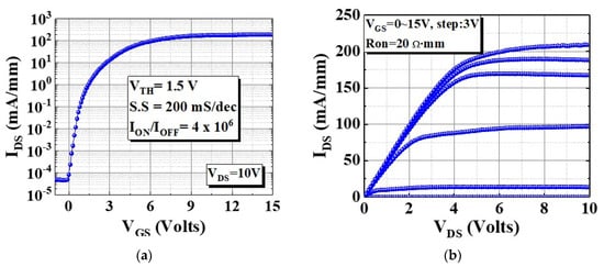 Figure 2a,b reveal the log-scale transfer (IDS–VGS) and output (IDS–VDS) characteristics of the device. As illustrated in Figure 2a, the off-state current was 5 × 10−5 mA/mm at VGS = 0 V. Additionally, the threshold voltage VTH was 1.5 V which is defined at IDS = 1 mA/mm. The corresponding maximum drain current density IDmax and Ron were 210 mA/mm and 20 Ω mm, respectively.