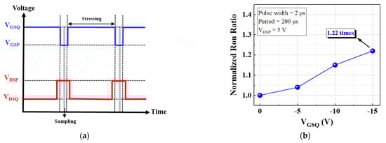 To observe the hole injection effect during gate operation, IGS–VGS measurements were made [Figure 3a]. The device exhibited a large gate operation voltage under forward bias, and the gate turn-on voltage VGS_ON was 18.5 V at IGS = 1 mA/mm. The device exhibited favorable gate behavior because of its higher barrier which effectively suppressed the carrier injection. As revealed by Figure 3b, the device exhibited a high off-state breakdown voltage of 763 V. We used pulse measurement to analyze the hole injection effect and dynamic characteristics of the device under various stress voltages VGSQ and durations. To evaluate the gate lag behavior we employed the AM-241 pulse measurement system [,]. The operation condition and gate lag measurement are illustrated in Figure 4a,b, respectively. Two bias conditions had to be considered: pulse voltage (VGSP and VDSP) and quiescent voltage (VGSQ and VDSQ). During the measurement, the pulse voltage switched rapidly to the quiescent voltage with a 2 µs pulse width and 200 µs period, and VGSQ was swept from 0 to −15 V in increments of −5 V. The device exhibited dynamic Ron of 1.22 times at VGSQ = −15 V.