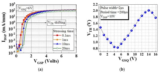 (a) Dynamic transfer characteristics measured for various stress durations, and (b) VTH shifting for different VGSQ.