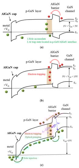 Schematic of the band diagram gate region of a p-GaN HEMT operating at (a) 1 V < VGS < 5 V, (b) 5 V < VGS < 15 V, and (c) VGS > 15 V.