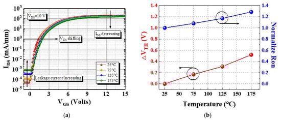 (a) IDS–VGS characteristics of the device at 25 °C to 175 °C, and (b) variation in VTH and Ron.