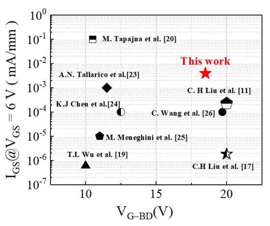 - Wu, T.L.; Marcon, D.; You, S.; Posthuma, N.; Bakeroot, B.; Stoffels, S.; Van Hove, M.; Groeseneken, G.; Decoutere, S. Forward bias gate breakdown mechanism in enhancement-mode p-GaN gate AlGaN/GaN high-electron mobility transistors. IEEE Electron Device Lett. 2015, 36, 1001–1003. [Google Scholar] [CrossRef]