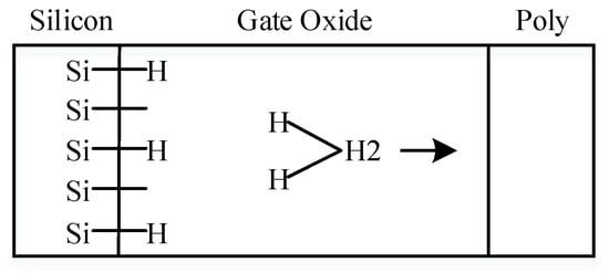 With the shrinking size of the integrated circuit and the thinning gate oxide thickness of MOSFETs, negative bias temperature instability (NBTI) has become a major reliability issue in modern CMOS technology [1]. It mainly describes the performance degradation of the PMOSFET when operating at negative gate bias and high temperature, which is mainly manifested as the threshold voltage shift, transconductance drop, and saturate current decrease of the PMOSFET due to the interface trap at Si/SiO2 and the trap charge generated in the gate oxide [2]. Researchers have proposed many models to interpret the degradation mechanism of NBTI, among which the reaction-diffusion (R-D) model has been widely applied [3]. The R-D model assumes that when a bias is applied to the gate, a reaction related to the electric field will occur at the Si/SiO2 interface, and the passivated Si-H bonds will be broken, resulting in interface traps, as shown in Figure 1. Meanwhile, the high temperature will weaken the existing Si-H bonds, so it will also aggravate NBTI [4].