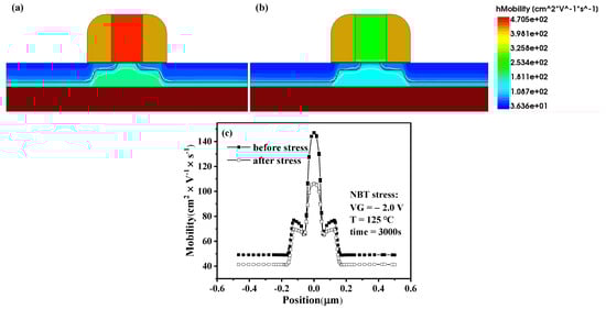 In addition, the reduction of the drain current at Vg = −1.2 V after NBT stress can be observed in Figure 3, and the drain current varies from 16.3 μA to 15.8 μA, the shift is about 0.5 μA. The drain current reduction is caused by the threshold voltage and mobility. The interface trap concentration at Si/SiO2 increased significantly after the stress, causing a chance of scattering of the device [17], and the internal carrier mobility decreased, resulting in the reduction of the drain current. This paper verifies this phenomenon through TCAD simulation; the results are shown in Figure 5. It is observed that the device channel carrier mobility declines after NBT stress. This is because under the conditions of high temperature and negative gate voltage, the internal lattice collision of the device is intensified, and the scattering probability increases, which leads to the deterioration of the carrier mobility.