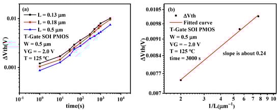 Figure 11a presents the time evolution of ΔVth degradation under different channel lengths. It can be observed from the figure that the threshold voltage degradation trend of PMOSFET under different channel lengths is similar, and with the decrease of channel length, the threshold voltage shift increases; that is, the degradation of NBTI becomes worse [22].