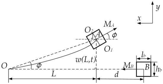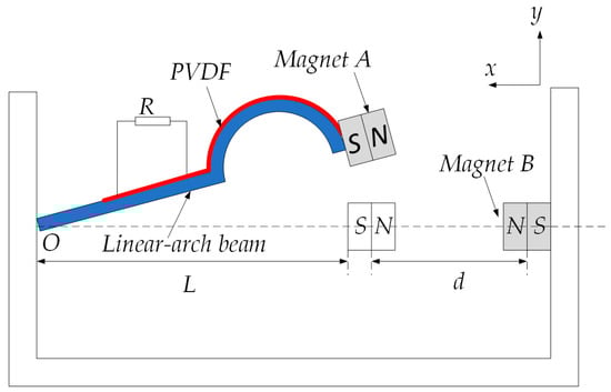 Figure 1 shows the schematic diagram of the LBPEH. The system is mainly composed of a linear-arch beam, Polyvinylidence Fluoride (PVDF), a fixture and magnets. PVDF is evenly pasted on the surface of the linear-arch beam, and the external resistor R is connected to the electrodes at both ends of the piezoelectric material. Magnet A is fixed at the end of the linear-arch beam, magnet B is fixed on the fixture, and magnets A and B maintain a magnetic repulsion relationship. The horizontal distance between them is d, and the horizontal length of the linear-arch beam is L. When the linear-arch beam is subjected to external excitation along the y-direction, it will bend and deform; the PVDF pasted on the surface of the linear-arch beam will also be deformed. The output voltage amplitude of the system increases with the deformation of the linear-arch beam.