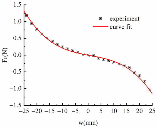 Figure 3 shows the experimental measurement and polynomial fitting results of the linear-arch beam, where = −56,681.227 , = 127.293 , = −13.99 are constant coefficients on third, second and first-order terms, respectively. It can be seen from Figure 3 that the polynomial fitting curve is not symmetric about the origin, which is mainly because the response displacement of the arch structure is different when the curvature increases and the curvature decreases under the same external force.