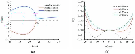 According to Equation (18), the static bifurcation of the system can be obtained, Figure 4a shows the static bifurcation results of the system. When the distance between the magnet at the free end and the magnet at the fixed end of the piezoelectric energy harvester is less than the distance between the bifurcation point = 23, the system has two stable solutions and one unstable solution. With the increase of magnet distance, the distance between two stable solutions increases first and then decreases, and the system is a bi-stable system. When magnet distance d > = 23 the system has only one stable solution, and the system is a monostable system. The stable solution is shifted upward, which is mainly due to the existence of the arch structure in the linear-arch beam leading to the deviation of its equilibrium position.