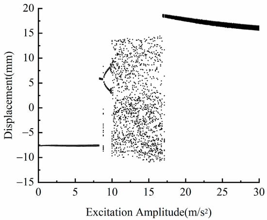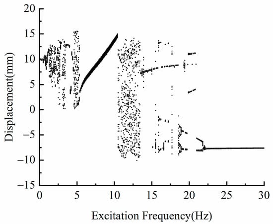 Let d = 18, A = 12, in order to explore the influence of the excitation frequency on the dynamic characteristics of the system. Figure 7 is the bifurcation diagram of the system at different excitation frequencies. It can be seen from Figure 7 that the frequency response characteristics of the system are very complex.