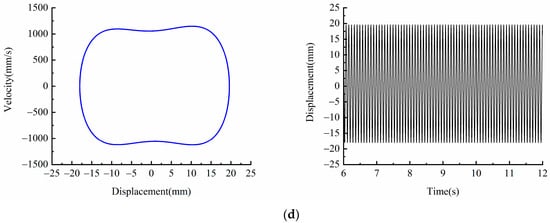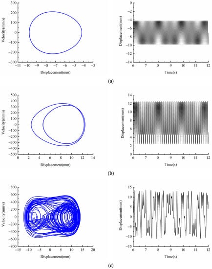 When the excitation frequency is in the range of 5.5, the piezoelectric energy harvester is in a state of chaotic motion. Figure 8a shows the phase diagram and time- displacement diagram when f = 2.5. In this case, the motion in and between the wells of the piezoelectric energy harvester exists simultaneously, and the system has high-energy output, but it is not continuous. When the excitation frequency is increased within the range of 5.5–10.5, the piezoelectric energy harvester is in a state of large periodic motion, compared with the chaotic motion state, the system has a continuous high-energy output at this time. It can be seen from Figure 8b that when the excitation frequency f = 8, the vibration displacement amplitude of the piezoelectric energy harvester can reach 15 mm.