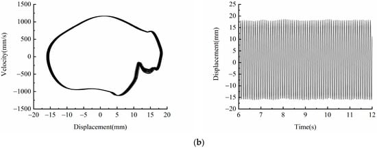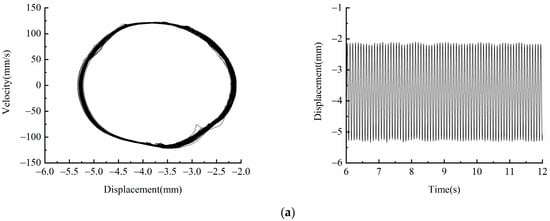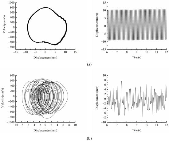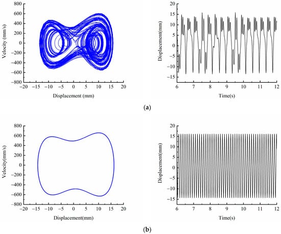 Experimental phase portrait and time-displacement diagram of different excitation frequency: (a) f = 8 ; (b) f = 12 .
