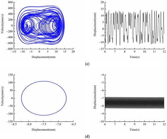 Phase portrait and time-displacement diagram of different excitation frequency f: (a) f = 2.5; (b) f = 8; (c) f = 12 ; (d) f = 25.