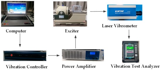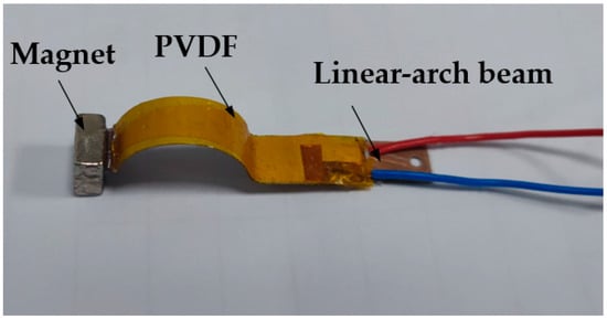 In order to verify the accuracy of the simulation analysis, an experimental platform was built for experimental verification. The experimental device is shown in Figure 9. It mainly includes the computer, vibration controller (VT-9008), power amplifier (GF-20), Exciter (E-JZK-5T), Laser Vibrometer (LV-S01) and vibration test analyzer (CoCo80-X). Figure 10 shows a linear-arch piezoelectric energy harvester consisting of a linear-arch beam, PVDF and a magnet. The PVDF is encapsulated with polyimide tape, and then evenly pasted on the upper surface of the linear-arch beam by epoxy resin. A magnet is glued to the ends of the linear-arch beam. In the experiment, a sinusoidal signal is set on the computer and sent out by the vibration controller. After being amplified by the power amplifier, it acts on the Exciter, so that the Exciter produces sinusoidal vibration, and the piezoelectric energy harvester is excited to vibrate. The terminal vibration velocity signal is measured by the laser vibrometer and stored in the vibration testing analyzer.
