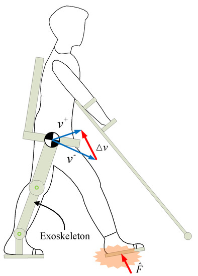Most lower-limb exoskeletons are fixed following predefined gaits collected from human clinical walking trials, such as ReWalk [4], EKSO [5], and Indego [6], etc. The center-of-mass (CoM) velocity of human-exoskeleton systems is redirected when swing feet hit the ground, and the speed variation results in the impact force acting on the foot plantar [7], as shown in Figure 1. The impact energy is gradually transmitted to the patient’s lower limb and trunk, to be ultimately absorbed by soft tissue, muscles, etc. [8]. The damage of the impact mainly comes from the peak of ground reaction force (PGRF). The excessive PGRF not only makes the patient uncomfortable, but may also leads to tissue damage and pain [7,8]. Therefore, the design of exoskeletons should be concerned with reducing the damage caused by the PGRF to patients.