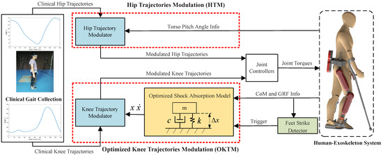 This section will introduce the OKTM and the HTM for the impact reduction of lower-limb exoskeletons. Considering that the ankle joints of most exoskeletons are passively driven, we mainly modulate the trajectories of the knee and hip joints. The framework of the proposed approach is shown in Figure 2. Clinical knee and hip trajectories can be acquired via motion capture systems from walking trials. CoM and GRF information can be computed with sensor data sampled from the exoskeleton. The feet strike detector was introduced in a previous paper [20], and it can detect the moments when swing feet fully touch the ground by plantar pressures and trigger the OKTM and HTM. The OKTM comprises two parts: the optimized shock absorption model (OSAM) and the knee-trajectory modulator. The OSAM can deliver an optimized spring-damping system response for hip–ankle distance variation (i.e., knee angle variation). The knee-trajectory modulator can combine the clinical knee trajectories with the output of the OSAM to produce the modulated knee trajectories. In addition, the HTM only includes the hip-trajectory modulator, which can modulate the clinical hip trajectories according to torso pitch-angle information and generate modulated hip trajectories. Finally, the desired reference joint angles and joint torques can be applied in the control of PID high-gain joint controllers.