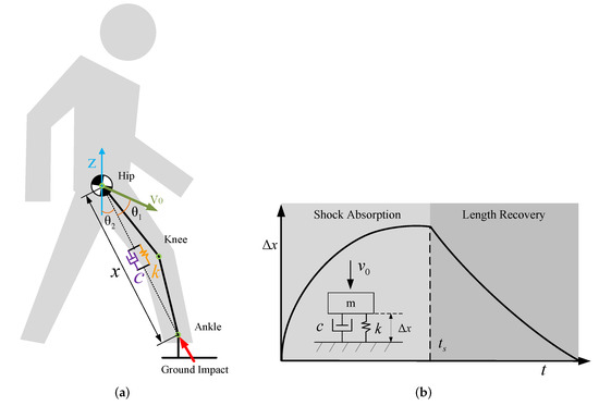 In this section, we present the OSAM of the OKTM. We focus on the shock absorption in the 2-D sagittal plane. Generally, the CoM of human-exoskeleton systems can be located on hip joints [21]. To deal with the impact force transmitted from feet to the CoM, we considered introducing a spring-damping system as the shock-absorption model, which shows shock-absorption behaviour [11]. In addition, we optimized the parameters of the model, i.e., OSAM. As shown in Figure 3a, the OSAM is placed along the direction from the CoM to the ankle joint, which includes a virtual spring with stiffness k and a virtual damper with damping c. The hip–ankle distance x is planned to track the response of the OSAM for shock absorption after feet strikes, and then restore the original length. The typical OSAM response is shown in Figure 3b, which contains two phases: shock absorption and length recovery. The slight knee-flexion angle for shock absorption is similar to the human walking response to adapt to ground or load [22,23]. The passive ankle joint is not described in detail because it is weakly related to the initial ground-contact impact.
