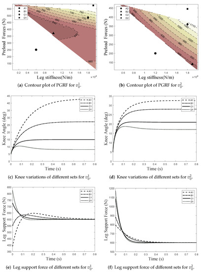 Contour maps of computational PGRF for and are proposed in Figure 7a,b. In each contour map, we selected four typical points from A to D, i.e., four sets of leg stiffness k and preload-forces for detailed display. On the one hand, the knee angles of the landing leg are simulated in Figure 7c,d, respectively. On the other hand, the support force of the landing leg are simulated in Figure 7e,f, respectively. Finally, the numerical results are shown in Table 2 and Table 3.