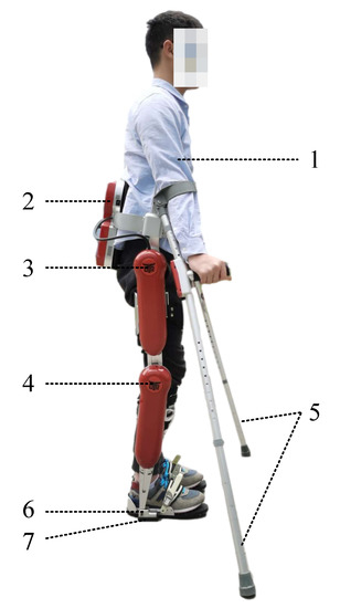 The AIDER exoskeleton system: 1: pilot. 2: backpack, with an embedded computer. 3 and 4: hip and knee flexion/extension joint activated by dc servo motors. 5: crutches. 6: passive ankle flexion/extension joint. 7: shoes with plantar pressure sensors inside.