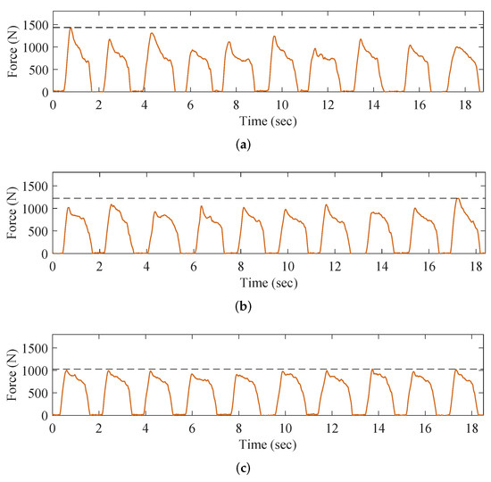 The performance of the OKTM was evaluated by comparing the PGRF between the three gaits. Periodic occurrence of force duration can be interpreted as the standing phases, e.g., 0.5 s to 1.7 s in Figure 9a. As expected, the PGRF often appears at the beginning of foot–ground collisions, e.g., 0.7 s in Figure 9a. This agrees with the result obtained by Jeongsu et al. [11]. At moments of strikes, movements of landing legs follow predefined trajectories and behave rigidly, resulting in sudden CoM velocity variations, thus leading to excessive PGRF. In contrast, the flexible movement of knee joints can reduce the PGRF, as shown in Figure 9b,c. In addition, the optimized knee stiffness and preload allow for more extended and more angular shock absorption, resulting in a lower PGRF for the MGB than the MGA. Table 5 and Table 6 compare two walking speeds by comparing the mean values and standard deviation values. The results suggest that the PGRF after strikes was reduced by implementing the proposed OKTM method. Periodic micro-force duration can be analyzed as swing phases, e.g., 1.6 s to 2.2 s in Figure 9c. Lower GRF during swing phases in Figure 9b,c indicate that swing feet are not scraping ground.