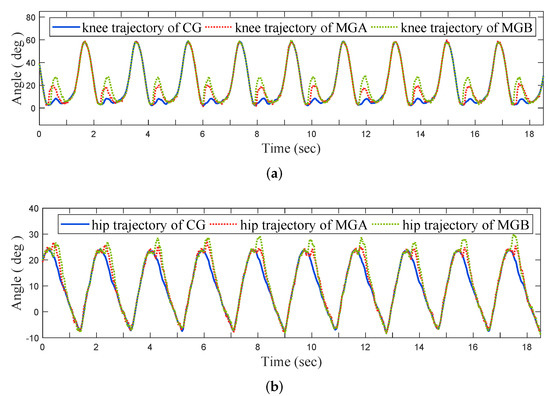 Experimental Results of the OKTM: To verify the effectiveness of the OKTM, we experimented with three gaits on the AIDER: The Clinical Gait (CG); Modulated Gait B (MGB), where parameters are optimized; and Modulated Gait A (MGA), where parameters are suboptimal (with and , where and are maximum values of k and satisfies the constraints in Equation (10), respectively). In addition, we tried two different walking speeds with these gaits: about 0.5 m/s and 0.25 m/s. In Figure 9, the GRF for three different gaits when walking at about 0.5 m/s are presented. The joint angles corresponding to Figure 9 are shown in Figure 10. For comparison, we aligned the gait period of MGA and MGB to that of CG.