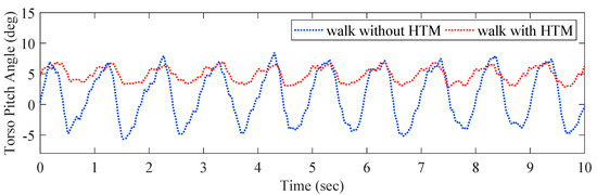 Experimental Results of the HTM: To verify the effectiveness of HTM, we show the effect of the HTM on the torso pitch angle when walking with the OKTM, as shown in Figure 11 and Table 7. In human walking, to easily shift weight to the front support leg, the pitch angle of the torso reaches a maximum before each foot–ground collision, and the torso is slightly tilted forward at this moment. When walking without the HTM, the OKTM modulates the knee joint of the front leg to flex rapidly, causing the torso pitch angle to decrease rapidly, and the torso is slightly tilted backward. This increases the burden on the patient’s sagittal balance and defeats the original purpose of keeping the torso angle stable during walking. In contrast, the introduction of the HTM can effectively reduce torso sway after swing-foot strikes, helping patients to walk more stably.