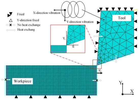 ABAQUS software is used to establish a 2D UEVC model, as shown in Figure 4. The amplitude and cutting depth of the UEVC process are at the micron level, and the ultrasonic frequency is set to 20 kHz. Therefore, micro-machining is used in the simulation process to more intuitively observe the material removal mode in the cutting process. The workpiece is made of metastable β titanium alloy with a size of 100 × 55 μm. The tool material is a single crystal diamond. In Figure 4, γ0 is 5° and α is 15°. To obtain better texture morphology, and because the cutting edge of single crystal diamond tool is very sharp, the blunt circle radius of its cutting edge reaches nanometer level. Therefore, the tool model in the simulation ignores the influence of the blunt circle radius of the cutting edge. ALE (Arbitrary Lagrangian Eulerian adaptive meshing) adaptive method is used to divide the mesh to reduce the error caused by excessive distortion of the element mesh in the simulation process. The single precision offset method is used to mesh the rake face and flank of the tool. The workpiece mesh type adopts CPE4RT (four-node plane strain thermally coupled quadrilateral element) and the tool mesh type adopts CPE3T (three-node plane strain thermally coupled triangular element). The mesh size of the upper part of the workpiece is 0.0003 × 0.0003 mm. The mesh size of the lower part is 0.003 × 0.0003 mm. The lower part of the workpiece does not contact with the tool, so the lower part of the mesh adopts a large size to reduce the amount of calculation. The lower left corner of the model is taken as the reference point, and the lower half and bottom of both sides of the model are constrained in a completely fixed way.