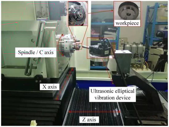 The experimental material is a new medical titanium alloy represented by metastable β titanium alloy (Ti-25Nb-10Ta-1Zr-0.2Fe). It has the characteristics of high plasticity, high elasticity, and high strength, and has good biomedical properties [,]. The cutting device adopted is the Taga ultrasonic elliptical vibration cutting equipment in Japan. It was installed on the MQ-350 two-axis precision lathe for UEVC experiment. Oil cooling is used to cool and lubricate the cutting area. The workpiece is a ring sample, one end of which is fixed to the three-jaw chuck of the lathe, and its end face is processed by UEVC. The schematic diagram of cutting device and workpiece is shown in Figure 6. A single crystal diamond turning tool is selected as the UEVC tool. The rake angle of the tool is 5°, the back angle is 15°, the arc radius of the tool tip is 1 mm, and the blunt radius of the cutting edge is 0.04 μm. The experimental parameters are shown in Table 2.