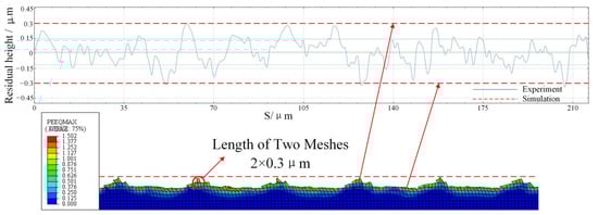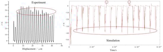 Figure 7 shows a comparison of the residual height of the machined surface between UEVC experiment and simulation under the same parameters. The dotted line in the figure is the upper and lower limits of the residual height obtained by simulation, and the solid line is the surface residual height obtained by experiment. The residual height obtained by simulation can be extracted by the query function in the software, and can also be obtained by calculating the number of meshes in the figure. Because the tool model in the simulation does not consider the blunt circle radius of the cutting edge, the residual height obtained by the experiment is generally within the upper and lower limits of the residual height obtained by the simulation. Due to the errors in the experiment and the influence of machine tool vibration, the residual height obtained in the experiment fluctuates up and down in a certain range. However, the overall fluctuation trend is within the limits of the simulation results. Combined with the cutting force comparison between the experiment and simulation process under the same parameters as shown in Figure 8, it is considered that the established UEVC simulation model has high accuracy. It can be seen from Figure 8 that the error of cutting force extracted by experiment and simulation is within 20%. The cutting force obtained from simulation and experiment has periodic characteristics. In the stage of tool–workpiece separation, the cutting force is 0.