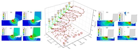 Figure 10 shows the evolution diagram of the force–thermal evolution law of the UEVC process. The circle in Figure 10 indicates the extreme points of cutting force and cutting temperature in each cutting cycle of UEVC. It can be seen from the curve in the figure that UEVC has the characteristics of tool-workpiece cycle separation. Compared with the high-temperature process at the moment of traditional cutting, the overall temperature rise trend of the UEVC process is slower. Under the simulation parameters of v = 140 mm/s, f = 20 kHz, ap = 0, t = 0.0008 s, the maximum temperature of the UEVC process does not exceed 120 °C;. Combined with the temperature cloud diagram and the temperature change curve, it can be seen that when the tool is not separated from the workpiece, the cutting temperature at the tool tip begins to decrease. The reason for this is that at this time, the speed of the tool along the positive direction of the Y-axis gradually increases, while it decreases along the X direction, and the contact stress between the tool and the workpiece gradually decreases. At this time, the temperature is at the maximum point of the cycle, the material plasticity is strong, and the stress state between the tool and the workpiece is weakened. The resistance of the tool when cutting the workpiece decreases, the tool–workpiece interface is about to enter the separation state, and the cutting temperature begins to decrease. Based on the temperature nephogram, the maximum temperature point in the temperature curve is extracted. It can be observed that the maximum temperature point in each cutting cycle occurs at the time at which the chip is about to break or at the beginning of fracture. At this time, the contact area and contact stress between the tool and the workpiece reach the extreme point.