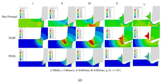 Figure 11a,b show the material removal mechanism of the UEVC process when the phase difference is 45° and 90°. It can be seen that the material removal methods are basically the same under the two cutting tracks. In the first stage of the cutting cycle, the tool tip just cuts into the workpiece. At this time, the cutting temperature is low, the material plasticity is weak, and there is low plastic deformation. It can be seen from the maximum principal stress diagram that the material is brittle under the extrusion of the tool. The cutting cycle enters the second stage, and the tool completely cuts into the material. At this time, the cutting heat is mainly concentrated in the material shear zone of the tool tip along the cutting speed direction. Under the influence of high temperature, the plasticity of the material is enhanced. Under the extrusion action of the cutting tool, the material produces high plastic deformation. Under the action of high temperature and tool extrusion, chip is gradually produced on the material surface, and adiabatic shear occurs. In the third stage of the cutting cycle, the vibration of the tool along the Y direction changes from negative to positive. The tool further extrudes the gradually generated chips, and the material undergoes adiabatic shear. Then the chip breaks and the fracture surface exhibits high plastic deformation, and the cutting temperature begins to drop. Through the above three stages, it can be found that the material removal process of UEVC is a state of “press–shear–pull” composite cutting. Firstly, the tool extrudes the material to preliminarily form chips. A shear force is then applied to the formed chip. The plastic deformation at the chip fracture indicates that a certain tensile stress is generated on the surface during the fracture. Under this cutting path in Figure 11a,b, the machined surface produces certain residual protrusions under the action of the tensile stress of the chip. The tool will then perform secondary cutting on the machined surface. In the fourth stage of cutting, the tool continues to vibrate upward. The vibrating cutter carries out secondary cutting on the machined surface and produces certain chips to make the machined surface more flat. In the fifth stage of cutting, the tool starts to exit the cutting state and enter the empty cutting stage of a cutting cycle. At this stage, the tool and material are separated. At this time, the cutting area is opened, and the lubricating fluid can fully lubricate the cutting area.