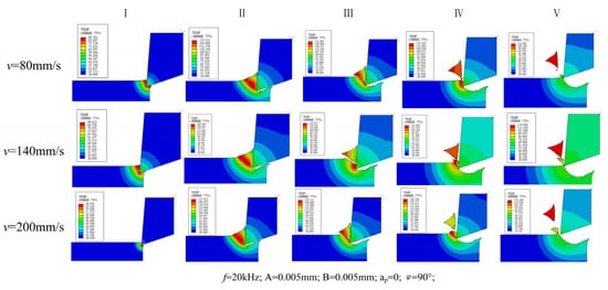 Figure 12 shows the temperature nephogram of UEVC material removal process at different cutting speeds. It can be seen from the figure that there is no significant difference in the material removal process when the cutting speed increases from 80 mm/s to 200 mm/s. It is consistent with the removal method under the phase difference of 90° analyzed above. From the temperature nephogram, it can be seen that the cutting temperature changes significantly under different cutting speeds.