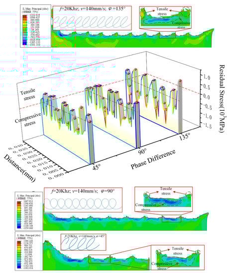 The residual stress of UEVC machined surface with phase differences of 45°, 90° and 135° is extracted to obtain the evolution diagram of residual stress on the UEVC material surface, as shown in Figure 13.