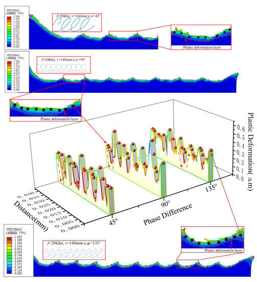 The plastic deformation value of the UEVC machined surface is extracted to obtain the evolution diagram of plastic deformation of the UEVC material surface, as shown in Figure 14. By analyzing the plastic deformation of the machined surface, it can be concluded that the degree of plastic deformation of the machined surface with phase difference of 45° and 90° is higher than that with a phase difference of 135°. In a cutting cycle under the two cutting trajectories, the plastic deformation value of the machined surface first decreases and then increases. At the same time, it can be found that the thickness of plastic deformation layer first increases and then decreases during a cutting cycle. The main reason for this is that there is compressive stress at the lowest point of the machined surface, and the stress transmission range is wider []. It leads to a wider range of plastic deformation along the depth direction. The reason the plastic deformation value is opposite to the thickness of the deformation layer is the different effect of stress []. At the beginning of a cutting cycle, the tool cuts downward, and the material surface bears the tensile stress in the cutting direction. Therefore, high plastic deformation occurs along the cutting direction, but the effect of compressive stress along the depth direction is weak. When the tool is near the lowest point, the material surface mainly bears the compressive stress along the depth direction, which is mainly manifested in the greater depth of plastic deformation. The different performance of the two trends further shows that there is a “press–shear–pull” transformation in the removal process of UEVC material.