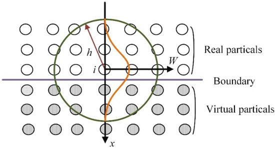 It should be noted that in the field of solid processing, the asymmetry of particle distribution at the boundary will cause the kernel function to be truncated, which will lead to solution errors. In order to avoid this problem, the virtual particle method is usually used to constrain the solid wall boundary [24]. The essence of the virtual particle method is to discretize the boundary of the solid wall into multiple rows of virtual particles. As shown in Figure 1, within the range of the smooth length h of the evaluation point i, when searching for the real particles of the nearest neighbors, the virtual particles should also be searched [25]. In this paper, the virtual particle model is used to calculate the cutting process of fused silica.