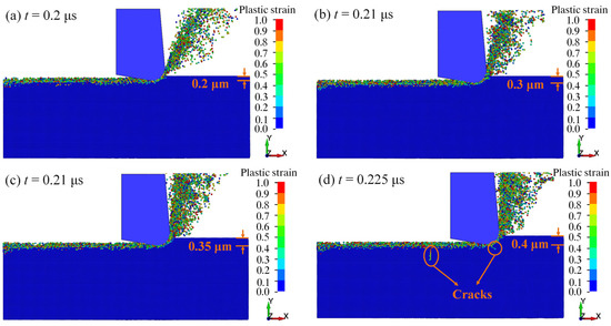 Figure 4 shows the plastic strain of fused silica under different processing depth ap at the tool edge radius r of 0.6 μm. When the SPH particle is separated from the workpiece, its damage value (D) reaches 1, and then it can be considered as invalid [27]. In order to better observe the distribution of SPH particles in the workpiece, some invalid particles that are separated from the workpiece have been deleted. When ap = 0.2 μm (Figure 4a), 0.3 μm (Figure 4b), and 0.35 μm (Figure 4c), there is no obvious subsurface crack generated during the cutting, indicating that the material has undergone ductile domain processing on a large extent. When ap = 0.4 μm (Figure 4d), obvious median cracks appear on the subsurface. Thus, the critical depth of the DBT of fused simulated silica is considered as 0.4 μm.