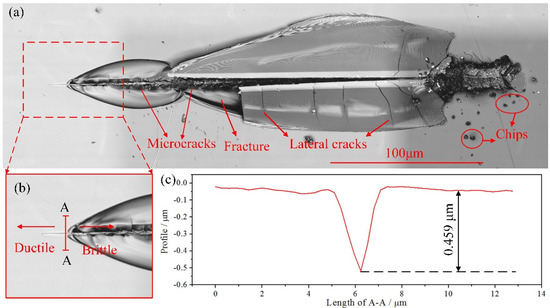 Figure 5 presents the scratch morphology of fused silica observed with a laser confocal microscope. Due to the variable cutting depth scratch process (Figure 5a), the scratch depth is very small at the initial moment, and the workpiece can be machined in the ductile region. Then, as the scratch depth exceeds the critical depth of the DBT, microcracks appear on the workpiece. With the increase of scratch depth, lateral cracks, fractures and chips occur, and the removal process changes to brittle removal. It can be seen from Figure 5b that when the scratch does not reach A-A, there is no obvious crack on the surface of the workpiece, which is manifested as ductile domain processing. When the scratch exceeds A-A, the workpiece is removed in the form of a brittle fracture. Therefore, it can be considered that a plastic-brittle transition has occurred at A-A. The profile at A-A is shown in Figure 5c. And the critical depth of the DBT of fused silica is approximately 0.459 μm. Obviously, it is close to the simulated result (0.4 μm). This proves the correctness of the SPH model to a certain extent.