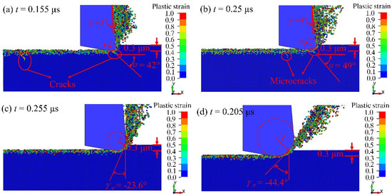 Figure 6 presents the plastic strain of fused silica under different edge radius r when the processing depth ap is 0.3 μm. α is the angle between the crack initiation direction and the surface of the workpiece. It can be seen from Figure 6a that the equivalent cutting rake angle γe is 5° when the tool edge radius is less than the depth of cut. At this time, obvious cracks occur in the workpiece (α = 45°), indicating that the material is brittlely removed. As shown in Figure 6b, the γe is also 5° when the tool edge radius is equal to the cutting depth, while only a few micro-cracks appear on the subsurface (α = 55°). The γe becomes −23.6° when the tool edge radius is 0.5 μm, exceeding the cutting depth, and there are no obvious cracks on the surface and subsurface of the material (Figure 6c). The value of the negative equivalent rake angle further increases, and it becomes −44.4° when the radius of the tool edge is 1.0 μm and the material has undergone ductile processing (Figure 6d).