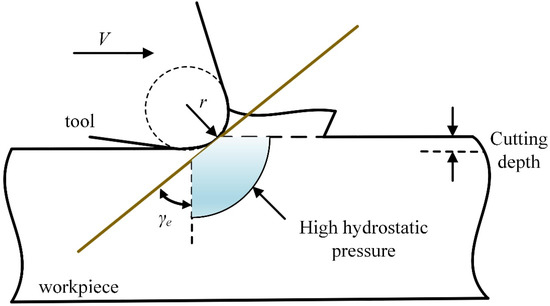 Usually, the tool edge radius easily makes the equivalent rake angle behave as a negative value, which causes the material in front of the tool to be squeezed and to form compressive stress similar to hydrostatic pressure, as shown in Figure 7 [29]. In fact, hard and brittle materials will show obvious plastic flow behavior under higher hydrostatic pressure [30].