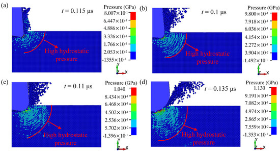 Figure 8 shows the hydrostatic pressure distribution under different tool edge radii. When r = 0.2 μm (Figure 8a), significant high hydrostatic pressure is generated at the front of the tool tip. When r = 0.3 μm (Figure 8b), the area of high hydrostatic pressure slightly increases. When r increases from 0.5 μm to 1.0 μm (Figure 8c,d), the high hydrostatic pressure expands forward and downward.