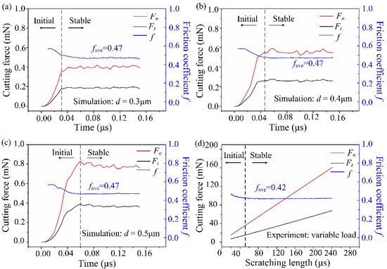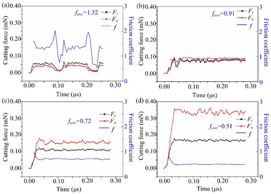 Simulated cutting force and friction coefficient at the tool edge radius of (a) 0.2 μm, (b) 0.3 μm, (c) 0.5 μm, and (d) 1.0 μm.