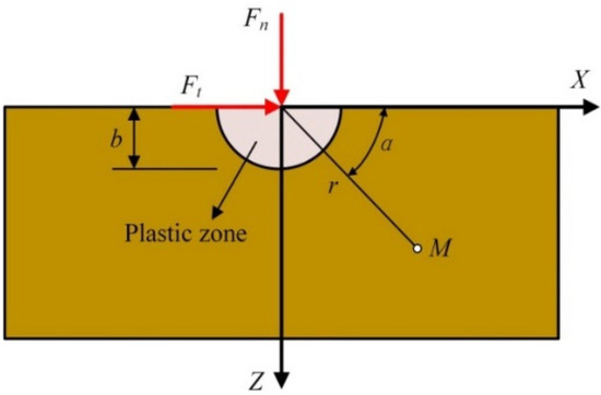 For the loading of an isotropic elastic substrate, the Flamant’s problem is that the force perpendicular to the edge of the half-plane (plane stress state) spreads radially in the substrate [31,32]. According to the Flamant’s problem, both the normal force Fn and the tangential force Ft will cause a stress field in the elastic area in the cutting process of hard and brittle materials, as shown in Figure 11. The radius of the plastic zone is b.