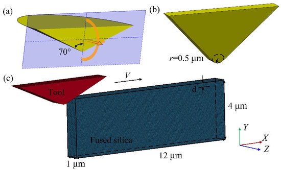 The indenter used in the nano-scratch experiment is a Berkovich indenter, which can usually be simplified to a cone with a half cone angle of 70°. A cross-sectional view of the cone along the midline is shown in Figure 13a. To make the tool used in the simulation and the indenter used in the experiment as similar as possible, a triangular prism diamond tool with a thickness of 1 μm and a tip radius of 0.5 μm was established (Figure 13b). The established cutting model is shown in Figure 13c, and the modelling method is the same as above (2.2). The cutting speed is 40 m/s, the cutting length is 6 μm, and the cutting depth d is 0.3 μm, 0.4 μm, and 0.5 μm, respectively.