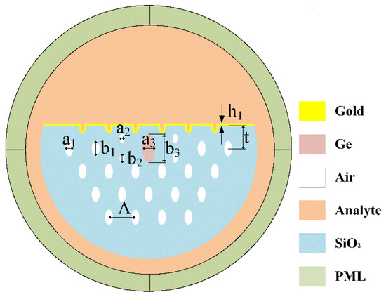 Figure 1 shows the schematic diagram of the germanium-doped PCF-SPR sensor. There is an oval lotus pink germanium-doped area in the center of the PCF. The cladding area of the PCF is hexagonal air holes (white), where the air holes are composed of two ellipses of different sizes. The design of small air holes and elliptical cores enhances the birefringence of the PCF-SPR, and the increased birefringence facilitates the coupling of the incident light to a specific direction, thus enhancing the coupling between the fundamental mode and the SPP mode [16,17]. In the cladding area, the semi-major and semi-minor axes of the large air holes are = 0.5 μm, = 0.25 μm, respectively, and the lattice pitch is = 2 μm. The semi-major and semi-minor axes of the small air holes are = 0.3 μm, = 0.15 μm, respectively. In the core region, the semi-major and semi-minor axes of the elliptical germanium-doped region are = 0.88 μm, = 0.4 μm. The radius of the photonic crystal fiber is . A gold film (yellow) of thickness = 50 nm is deposited on the polished surface of the D-shaped PCF, which enables the excitation of surface plasma polaritons (SPP). is the distance from the plane of polishing to the fiber core; analyte liquid can flow over the top of the cross-section, and the RI of the analyte . The D-shaped PCF-SPR can be manufactured by the side polishing method [18]. In the construction of this paper, the fiber is made of silica, whose RI is established by the Sellmeier formula [19]:
