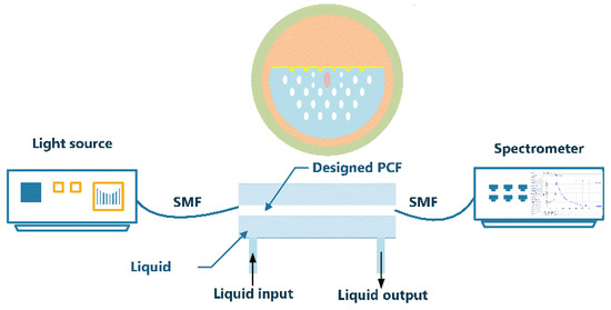 where is the vacuum wave number. From this, we can know that the confinement loss is proportional to the imaginary part of the effective refractive index (). To obtain accurate calculation results, a Perfect Matching Layer (PML) is added along the exterior of the model to absorb all waves from the simulation area [22]. The simulation process is completed by the multi-physics simulation software COMSOL MultiPhysical. The experimental device is to place the PCF-SPR sensor between two single-mode fibers (SMF). The light from the white light source is transmitted through the designed PCF, and finally, the spectral response was measured using an optical spectrum analyzer. Figure 2 shows the experimental set-up of the sensor.