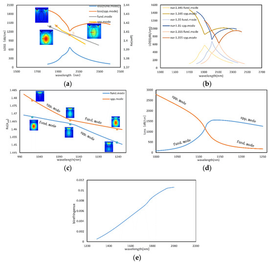 From the above discussion, it can be concluded that in the whole wavelength range, the loss spectrum of x-polarized is sharper and more sensitive to the change of RI. According to Figure 3e, as the wavelength increases, the difference between the two polarization modes increases, which means that the effect of birefringence becomes more prominent. The birefringence will cause a strong coupling of the polarization mode with the fundamental mode, which enhances the sensitivity of the sensor [15]. The resonant wavelength of the x-polarized lies at a much larger wavelength, so the following will focus on the sensing properties of the x-polarized of the fundamental mode.