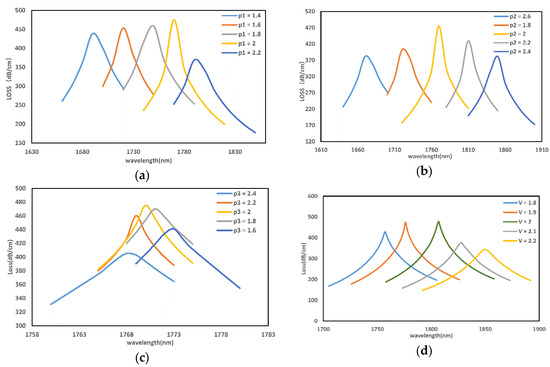 Figure 4a shows that the resonant wavelength becomes larger as p1 increases. During 1.4–2, the coupling is gradually enhanced as the air holes increase, bringing the metal film closer to the fiber core. When 2–2.2, as increases, the core confinement capacity starts to increase, and the confinement loss gradually decreases.